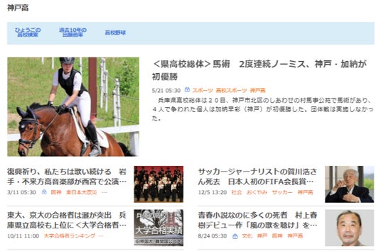 過去10年の倍率のページからは、各高校の紹介ページに簡単にアクセスできるようになりました。紹介ページでは神戸新聞NEXTで取り上げたニュースがずらりと並び、各校の取り組みや特色を知ることができます。