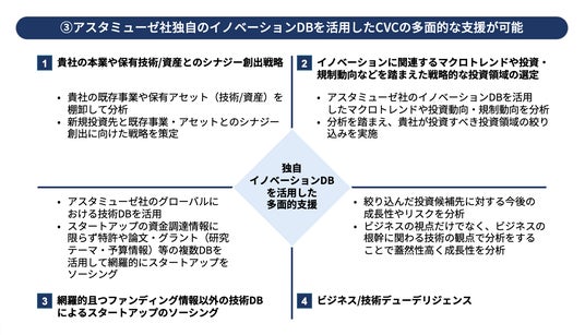 アスタミューゼ社と連携し、技術シーズのソーシング、デューデリジェンス等をハイレベルで対応