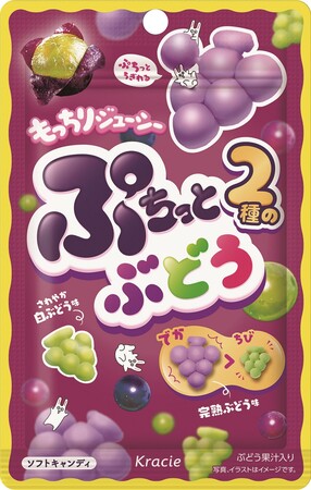 「ぷちっとぶどう」は、ぷっくりとした「でかぶどう」と「ちびぶどう」の2つの形が入っています。味は「完熟ぶどう味」と「すっきり白ぶどう味」の2種類です。