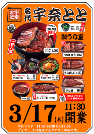 平日のランチは「名代 宇奈とと」、ディナーと土日祝は「日本橋紅とん」という二毛作体制で営業します。なお、ディナー時間帯や土日祝でも「名代 宇奈とと」のおいしい鰻料理をテイクアウトでお楽しみいただけます。