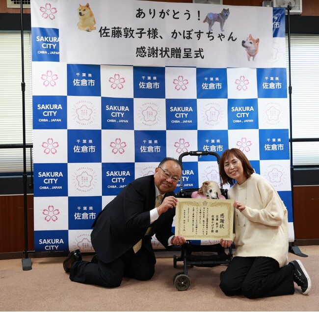 千葉県佐倉市在住で、世界中から愛される柴犬「かぼすちゃん」と飼い主・佐藤さんは、日頃よりブログやSNSで佐倉の魅力を発信し、知名度向上に貢献されています。また、佐倉ふるさと広場にモニュメント及びベンチ、テーブルを寄贈しました。この功績を称え、佐倉市から感謝状を贈呈しました。