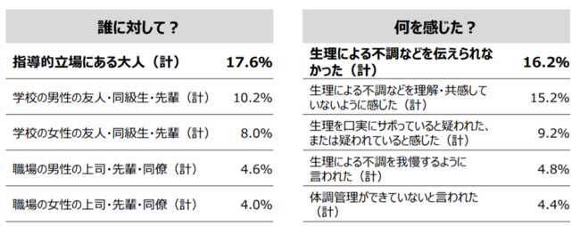生理に起因する日常の不便としては、外出先での生理用品の不足や学校の授業や課外活動での欠席や早退などの他、教師ら指導的立場の大人に不調を伝えられない、不調を理解してもらえないなど、周囲の配慮や理解の不足による精神的負担も見受けられました。また、過去1年間に経済的な理由で生理用品が買えなかった、交換頻度を下げた、代替品を用いたなどの経験を持つ人は15.1%に上りました。生理用品を軽減税率の対象とすべき(女性71.6%)、公共トイレ等で無償配布すべき(女性63.4%)など、生理に起因する経済的な負担への不満も浮き彫りにされています。