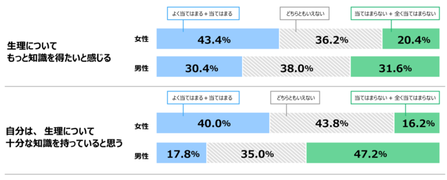 生理について十分な知識があると感じている人は、女性で40.0%、男性で17.8%。女性の74.4%、男性の61.0%が「男性にも生理に関する知識がもっと必要だ」とするなど、多くの若者が知識不足を感じている実態が明らかになりました。男女とも5割前後が生理に関する情報源として学校の授業と答え、授業の量・内容に満足している人は全体の3割以下に留まり、学校で教えて欲しい内容として、生理に関連する医薬品(女性70.0%)や生理中の女性への配慮(男性56.0%)などが挙がりました。