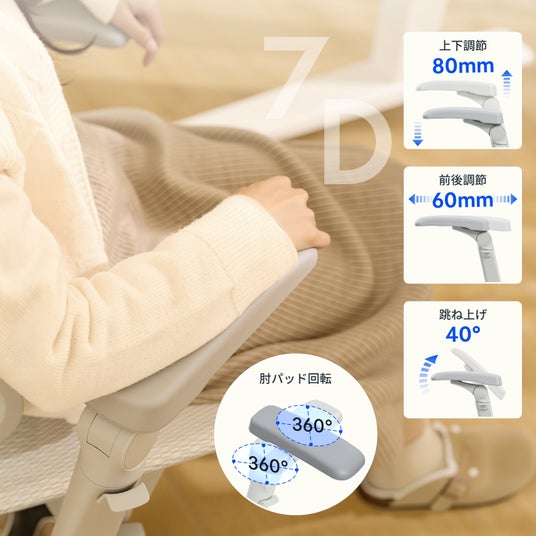 三軸可動による7D調整機構を採用し、上下・前後・左右・角度調整・跳ね上げなど、複合的な動きに対応。リクライニング時にも自然に連動し、キーボード入力やマウス操作時など、さまざまな作業姿勢において腕の位置を無理なくサポートします。肩・首・前腕への負担を抑え、長時間の作業でも快適性を維持します。