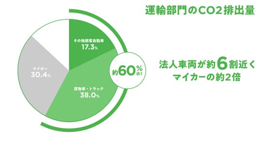 CO2排出量に関する統計※2によると、運輸部門においては法人車両の排出量が約6割近くを占め、マイカーの排出量の約2倍に上るなど、法人車両のCO2削減が急務となっています。現在、脱炭素社会の実現に向けて、多くの企業がCO2排出量削減目標を掲げ、法人車両のEV化等の施策を進めています。一方で、EV車両の普及および利用拡大のためには、車両のみならずEV充電設備の普及も不可欠であり、適切な充電機会の確保が課題となっています。