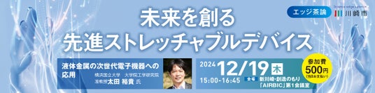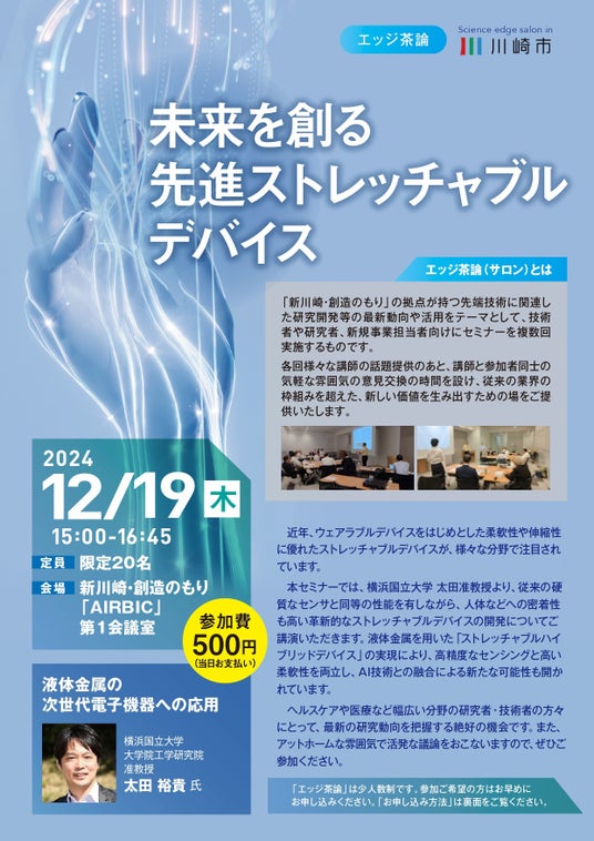 2024年12月19日(木) 、 横浜国立大学 太田准教授より、従来の硬質なセンサと同等の性能を有しながら、人体などへの密着性も高い革新的なストレッチャブルデバイスの開発についてご講演いただきます。是非ご参加ください。