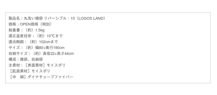 【 丸洗い寝袋 リバーシブル・10(LOGOS LAND)】 https://www.logos.ne.jp/products/info/5178