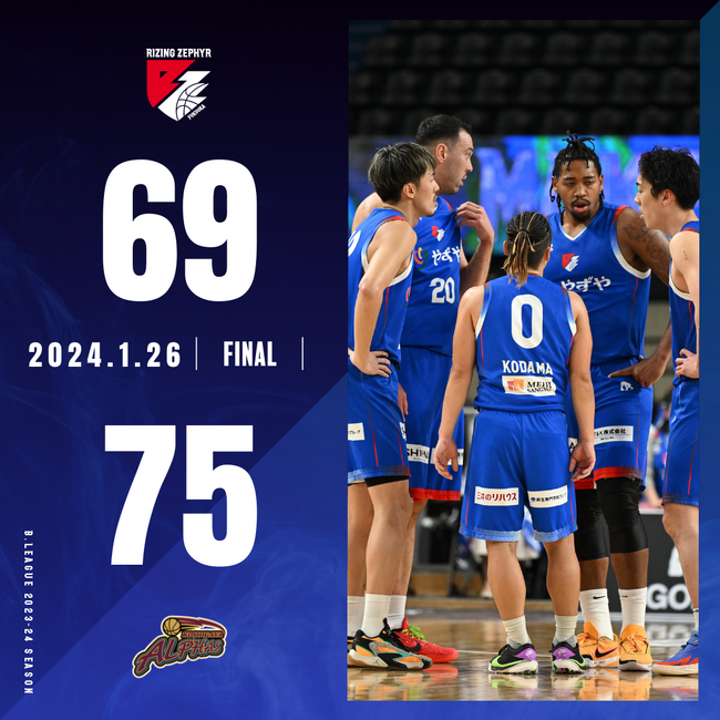 2024年1月26日(金)に開催されました【ライジングゼファーフクオカvs.越谷アルファーズ】において“福岡69-75越谷”の結果となりましたことお知らせいたします。