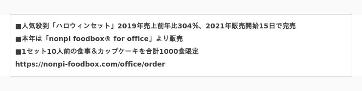 そして本年は「nonpi foodbox(R) for office(*1)」よりハロウィンセットを販売いたします。「nonpi foodbox(R) for office」は、小分け・フィンガーフードをメインとした、サイズ感や彩りにもこだわった料理を取り揃えており、そのままテーブルに並べるだけで映えるメニューを用意しました。