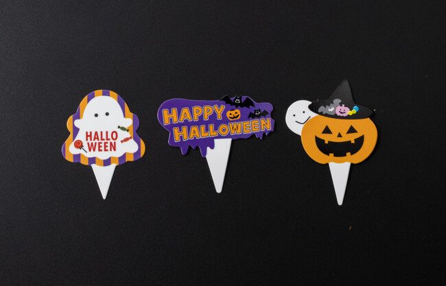 上記3種のハロウィンピック(計10個)の他、使い捨てペーパークロス(オレンジ・黒 各1枚)のハロウィン装飾がセットに含まれています。