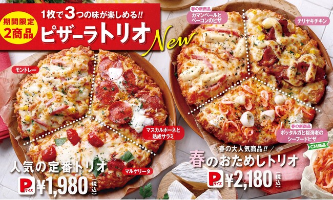 お一人やお二人でご注文のシーンや、お好みのピザを追加でもう1枚楽しみたいときなど、食べごろサイズで気軽にご利用いただけるP(パーソナル)サイズ。ハーフ&ハーフでのご利用も人気のPサイズに、1枚で3種の味をお楽しみいただける『ピザーラトリオ』が新登場!新発売の「春のおためしトリオ」と「人気の定番トリオ」の2商品をぜひお試しください。
