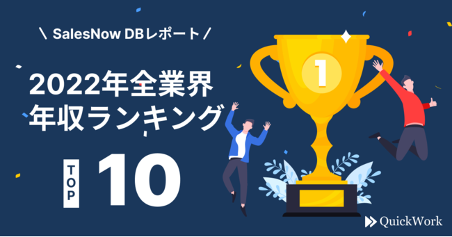 「データとテクノロジーで、働き方を変革する。」をミッションに掲げ、日本全国500万社以上の企業データを基盤に営業の効率化を支援する「SalesNow」を展開してきた株式会社QuickWork(本社:東京都渋谷区、代表取締役:村岡功規、以下「QuickWork」)は、日本全国500万社以上の企業情報を網羅した日本最大級のデータベースを誇る「SalesNow DB」において、2022年全業界年収ランキングTOP10を抽出したのでお知らせします。