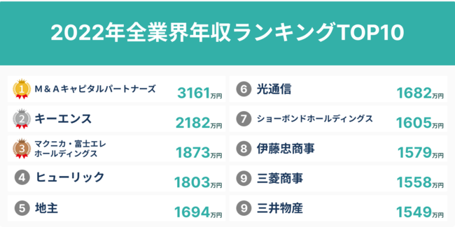 第一位はM&Aキャピタルパートナーズ株式会社。日本の中堅・中小企業を対象としている独立系M&Aアドバイザリー・仲介会社です。高年収帯の上場企業と比較しても非常に高い水準と言えます。マーケットが拡大し続けていることによるM&Aアドバイザーの人材希少価値と、利益率が高いビジネスモデルであることが理由に挙げられます。