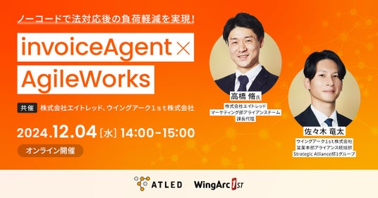 ワークフローシステムのリーディングカンパニーであるエイトレッド(本社:東京都渋谷区、代表取締役社長:岡本 康広 以下、エイトレッド)は、ウイングアーク1st株式会社と共催でオンラインセミナー『ノーコードで法対応後の負荷軽減を実現!invoiceAgent×AgileWorks』を2024年12月4日(水)に開催いたします。