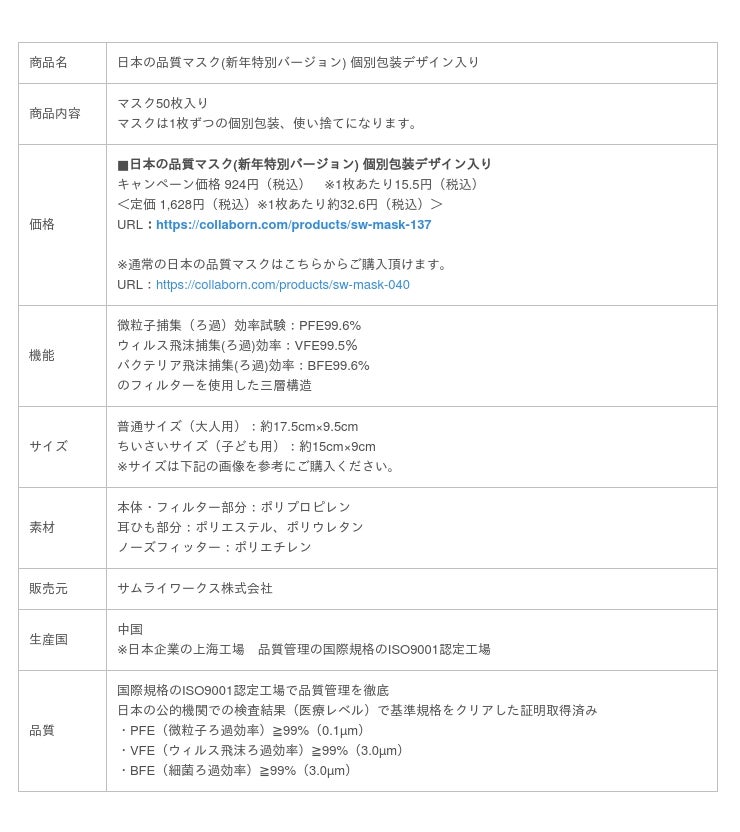 サムライワークス株式会社(代表取締役社長:新島 実 本社所在地:東京都渋谷区)の"日本の品質マスク<新年特別バージョン>個別包装デザイン"の数量限定追加販売・ファイナルセールが決定致しました!売り切れ次第終了となります!