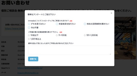 株式会社immedio(本社:東京都渋谷区、代表取締役:浜田 英揮、以下immedio)が提供する”決まる商談が増える”AIインサイドセールス「immedio(イメディオ)」が、資料や動画を閲覧中の顧客に対してその場でアプローチできる「アンケート機能」を、immedio Boxにてリリースしたことをお知らせします。