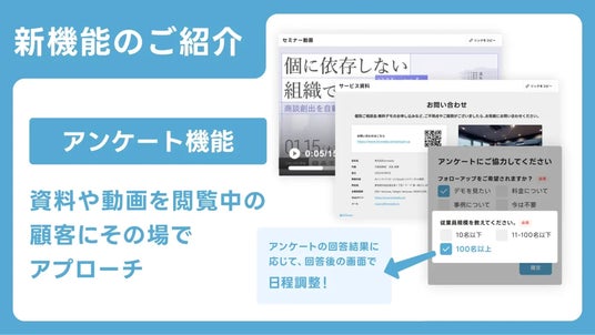本機能では、資料や動画の閲覧中にアンケートを表示し、顧客の関心や検討状況を把握します。