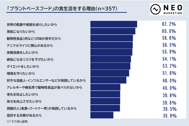 しかし、「環境を守りたいから」と回答した割合も比較的高く、「ダイエットをしたいから」「美肌になりたいから」よりもそれぞれ5ポイント・8.4ポイント高い26.6%となりました。