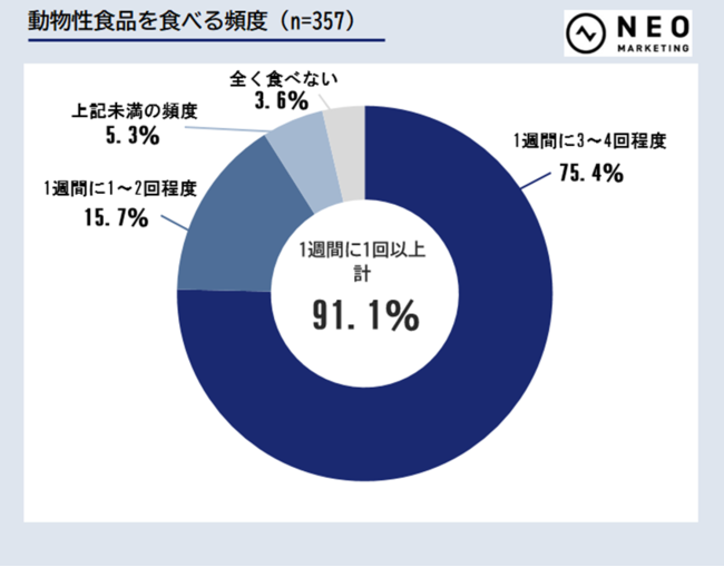 動物性食品を食べる頻度について、「全く食べない」方から「1週間に3~4回程度」までの頻度の方で、かつ、植物性食品を食べる頻度が「毎日」「1週間に5~6回程度」「1週間に3~4回程度」までの頻度の方を対象としています。