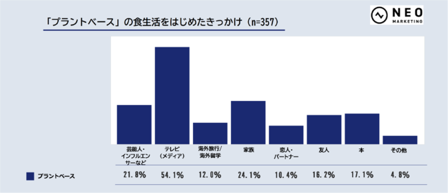 プラントベースの場合は「テレビ(メディア)」をきっかけとする割合が最も多く、半数を超えました。一方ビーガンは「芸能人・インフルエンサーなど」で56.8%を集めています。