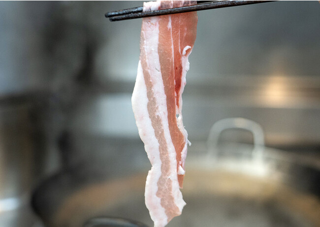 冷やしサンラー麺では、脂の甘さ、赤身の旨さが揃ったモンヴェールポークのバラ肉を使用します。