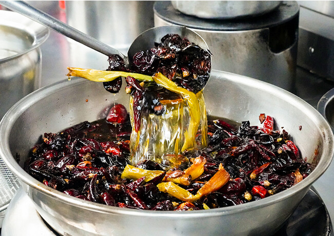 赤坂四川飯店では、5種の唐辛子、山椒や桂皮、チョウジなどのスパイス、生姜や葱といった香味野菜を使いラー油を手作りしています。香ばしい匂いと豊かな風味が特徴です。「辛い」ではない、旨みを味わえるラー油です。
