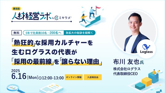 Personality Techを通じ「採用のミスマッチ」と「従業員の離職」を減らすHR事業「ミキワメ」を提供する株式会社リーディングマーク(本社:東京都港区、代表取締役社長:飯田 悠司)は、2025年6月16日(月)12:00-13:00にて、オンラインイベント「人材経営ラボ」(ゲスト:株式会社ログラス 代表取締役CEO 布川 友也氏)を開催します。