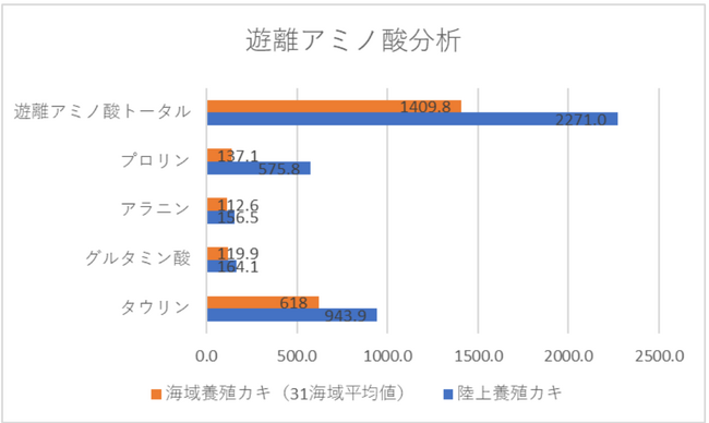 また、完全陸上養殖により生育した牡蠣の味に関しては、国立研究開発法人水産研究・教育機構との共同研究による遊離アミノ酸の分析結果より、甘味の強い牡蠣である特徴があげられました。そのほか、北海道から九州までの29海域で養殖された31検体の牡蠣の成分分析結果と比較したところ、タウリン※10、グルタミン酸※11、アラニン※12、プロリン※13、及び、遊離アミノ酸トータル量が高値を示しました。アミノ酸はそれぞれ栄養機能性を持つものとタンパク質を構成しているものが多いため、栄養価値も高いと評価されました。