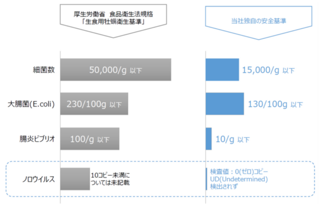※6 食品衛生法で定められた生食用牡蠣の規格基準は細菌に関する3種のみで、ノロウイルスは自主検査です。ゼネラル・オイスターのノロウイルス自社基準は国が定める10.0コピー未満を陰性、10.0コピー以上を陽性という基準に対して、リアルタイムPCR法により0.1コピーでも検出されたロットは流通しません。そのため、検出数162検体は自社基準による0.1コピー以上検出された検体数です。