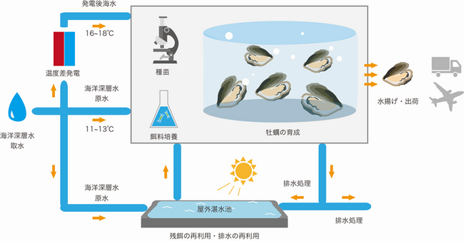 この度誕生した”あたらないカキ”は、沖縄県久米島の海洋温度差発電の発電後海水※15を二次利用しています。発電に使用された海洋深層水は、清浄性や富栄養性は保たれたまま、水温が上昇し、牡蠣の生育に最適な水温となっています。
