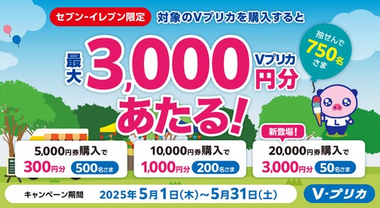 ライフカード株式会社(本社:神奈川県横浜市/代表取締役社長:増井 啓司)が発行するVisaプリペイドカード「Vプリカ」について、2025年5月1日(木)より、セブン‐イレブン限定で20,000円券種の販売を開始いたします。これにあわせて、抽せんでVプリカがあたるキャンペーンを実施いたしますので、お知らせいたします。