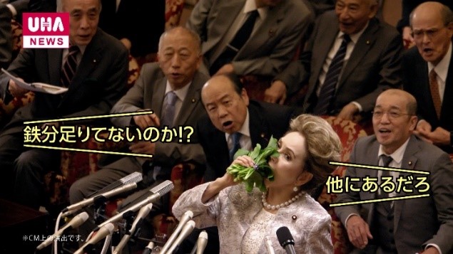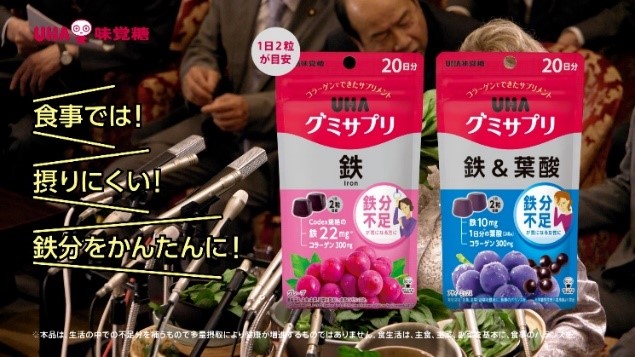 美味しく手軽に続けやすいサプリメントシリーズ「UHAグミサプリ」。普段の生活ではなかなか十分に摂取できない鉄分を、簡単に美味しく補給できることを伝えるため、デヴィ夫人を「鉄の女」として起用した新CMを制作しました。CM内では、一見強そうに見える「鉄の女」(=国のリーダー)が、実は鉄分不足に悩むがあまり、周囲が驚くような勢いで鉄分補給を試みます。そんなに大変な思いをしなくても、手軽に鉄分が摂取できる「UHAグミサプリ」の特徴を、デヴィ夫人の体を張った演技で印象付けていきます。一度見たらなかなか忘れることができない新CMにご注目ください。