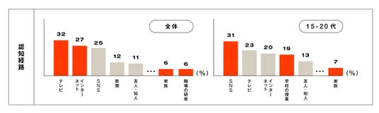 認知経路は「テレビ」「インターネット」など。若年層は「SNS」「学校教育」が特徴。「家族」「職場」経由は1割に満たない結果に。