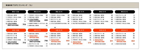 ・尊重されている項目「恋愛・結婚の自由」や「からだのプライバシー権」が上位に。