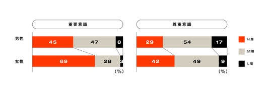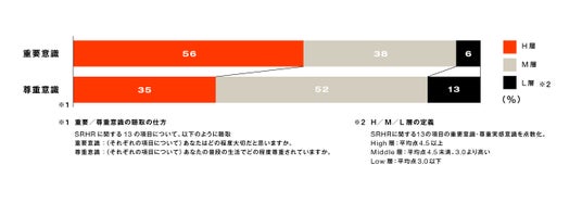 重要意識: (それぞれの項目について)あなたはどの程度大切だと思いますか。尊重意識: (それぞれの項目について)あなたの普段の生活でどの程度尊重されていますか。※2 SRHRに関する13の項目の重要意識・尊重実感意識を点数化。High層:平均点4.5以上。Middle層:平均点4.5未満、3.0より高い。Low層:平均点3.0以下。