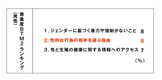 男性は、「性的な行為の相手を選ぶ自由」 が尊重されていないと感じる傾向。
