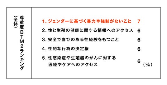 尊重されている項目「恋愛・結婚の自由」や「からだのプライバシー権」が上位に。