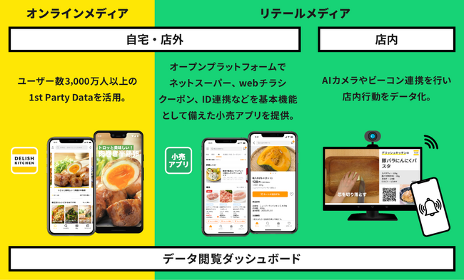 エブリーは「リテールメディア」である店頭サイネージのさらなる拡大と、店外での接点を創出する小売アプリの開発・導入を推進しています。小売アプリは、ネットスーパーやwebチラシ、クーポン、ID連携などを基本機能として備えたオープンプラットフォームによるサービス提供で、アプリ運用から顧客データ分析、商品管理、配送までオールインワン!『DELISH KITCHEN』のアセットを最大限活用しながら、生鮮の売上向上やユーザー送客を目指せます。