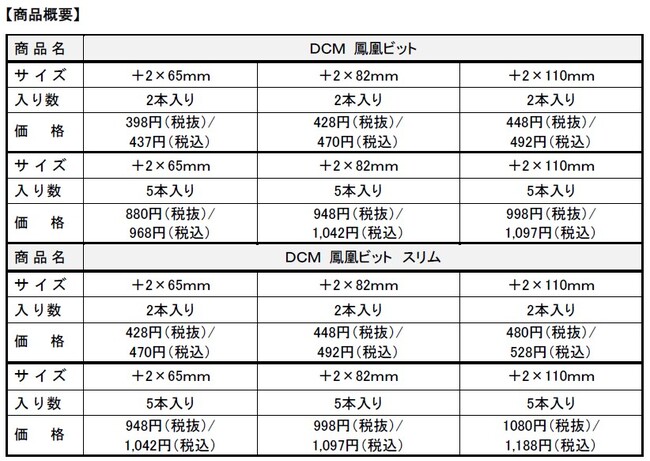 DIYが人気となっており、使用する工具にこだわる人が増えています。先端工具(ビット)は、電動工具でネジ類を締めたり緩めたりするために必要な部品で、高硬度素材で強度があるものが重宝されています。しかし、ユーザーからは高硬度素材のビットは価格が高いという声がありました。そこで、今回DCMは、高硬度素材を使用することにより強度と粘りを兼ね備えた「DCM 鳳凰ビット」を発売します。高トルクの電動工具を使用してもねじれに強く、トルクの伝達性能に優れた特性を持ちながら、お求めやすい価格の商品です。
