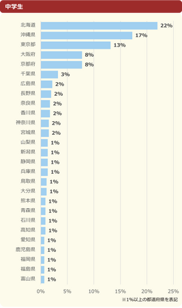 トップ2の「北海道」「沖縄県」ですが、小学生の1位は「沖縄県」で、中学生の1位は「北海道」となりました。次いで「東京都」「大阪府」と、大都市に回答が集まりました。