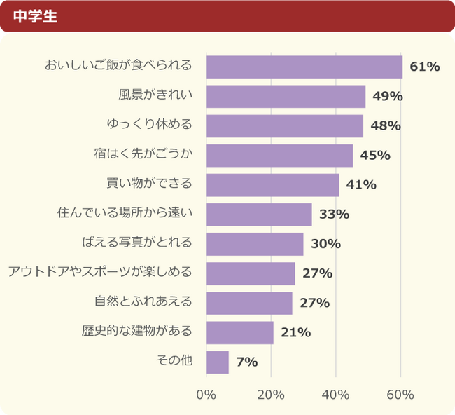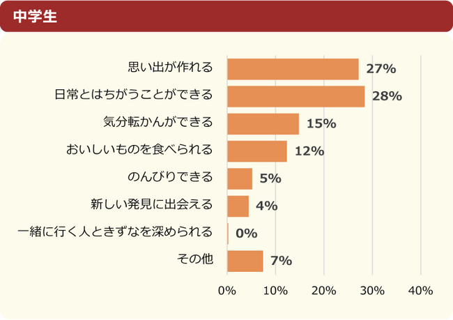 家族と旅行に行くことが好きな理由の1位は「思い出が作れる」でした。中学生の回答では、「日常とは違うことができる」がわずかに「思い出が作れる」を抜いて1位でした。中学生になると、だんだんと家族と楽しんだ思い出よりも自分自身の経験を重視するような傾向があるのかもしれません。