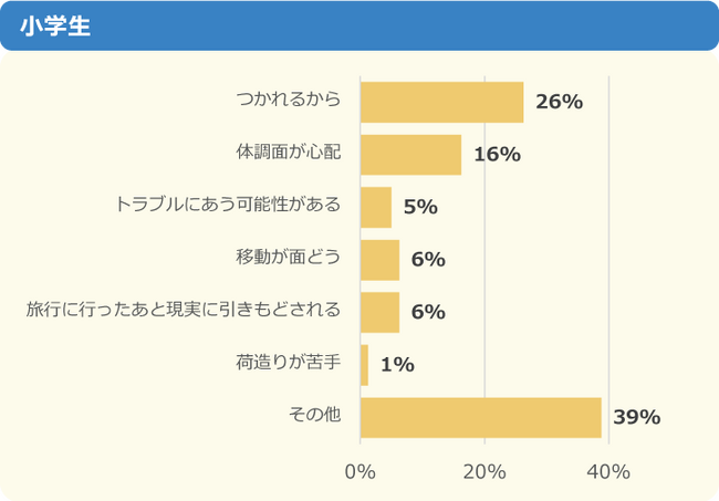 小学生では「その他」を除くと「疲れるから」が最も多く、次に「体調面が心配」が16%でした。一方、中学生では小学生の結果と同様に「疲れるから」が1位でしたが、「体調面が心配」はわずか5%でした。