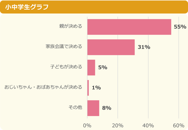 全体の半数以上が「親が決める」と回答しました。31%の人が「家族会議で決める」と回答したことから、旅行先を家族で決めるためコミュニケーションを取っている家庭も一定数あることがわかりました。
