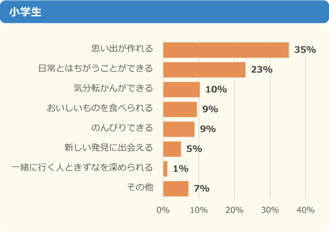 親族との思い出や忘れられない体験、大自然に触れ合ったことなどさまざまな意見が寄せられました。中には「お土産を選んでたら友達とばったり会った」とまるでサプライズのような思い出もあり、それぞれの子どもたちの旅の思い出があることがわかりました。