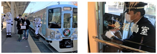 参加者は、池袋駅より出発して食事を楽しみながら西武球場前駅へ。到着後は、レオ・ライナとの記念撮影や、車掌体験が行われました。