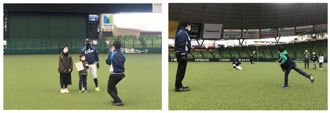 西武球場前駅からメットライフドーム移動後は、山田遥楓選手から自筆のサイン色紙とボールが渡され、写真撮影やキャッチボールが行われるなど、大いに盛り上がりました。