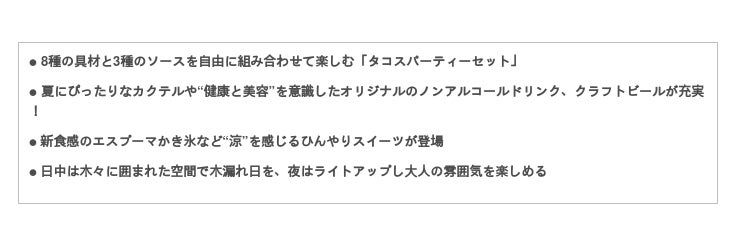 緑に囲まれたミッドタウン・ガーデンには、「MIDPARK LOUNGE」(ミッドパーク ラウンジ)が期間限定オープン。様々な具材やソースを自由にアレンジして手軽にタコスパーティーが楽しめるセットや、ハーブやスパイスを使用した夏にぴったりなオリジナルメニューが登場。さらに爽やかなカクテルのほか、オリジナルのノンアルコールドリンクも充実!木漏れ日が心地よい屋外ラウンジで夏の“涼”を感じながら、くつろぎのひとときをお過ごしください。
