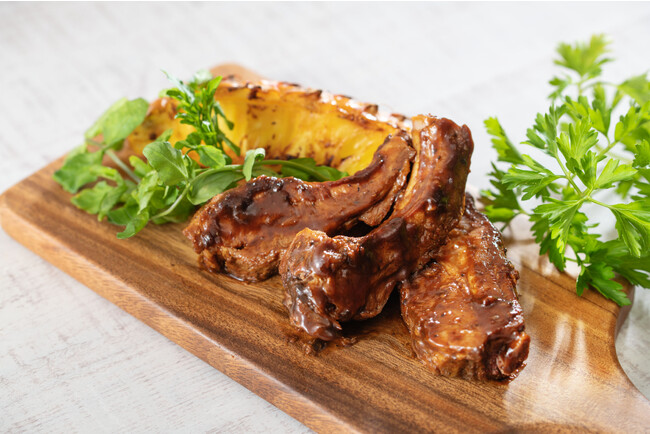 柔らかい肉質・少ない脂身が特徴のポークバックリブを、オリジナルのBBQソースで焼き上げたスペアリブ。グリルしたパイナップルとの相性も抜群。