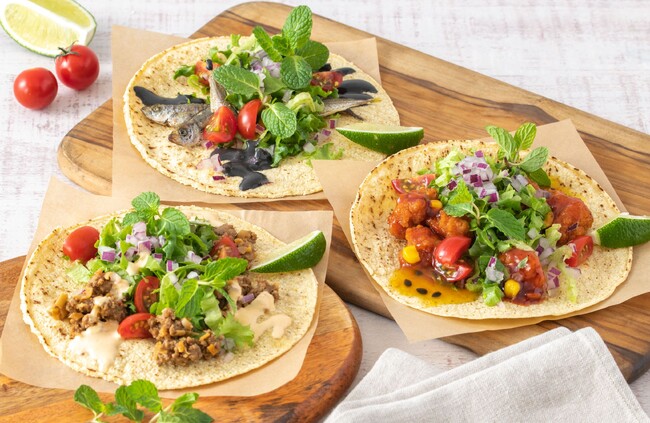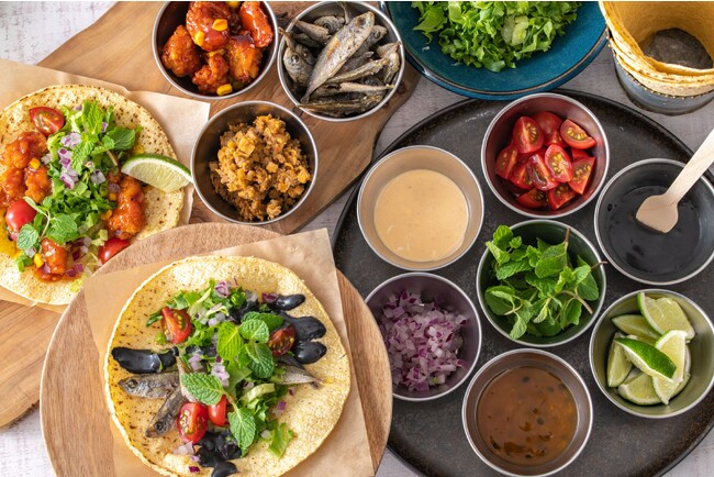 メインにはラム肉のタコミート・ヤンニョムチキン・豆アジのフリット、他にもトマトやレタスなど8種の具材と、トムヤムクンソース・パッションフルーツソース・イカ墨ソースの3種のソースをご用意しました。仕上げに爽やかなミントをのせ、ライムを“ギュッ”とたっぷり絞るのがおすすめ!変わり種の具材やソースを自由にアレンジしてオリジナリティあふれるタコスをお楽しみください。