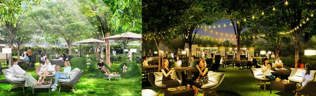 木々に囲まれた「MIDPARK LOUNGE」。日中は木漏れ日が降り注ぎやさしい光に包みこまれるような感覚に。
